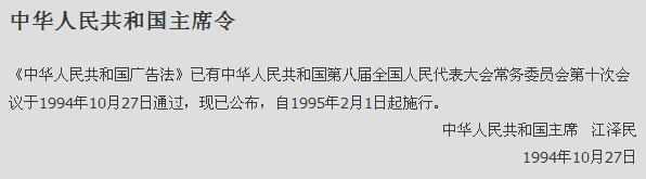 第四十九條 本法自1995年2月1日起施行。本法施行前制定的其他有關(guān)廣告的法律、法規(guī)的內(nèi)容與本法不符的,以本法為準(zhǔn)。