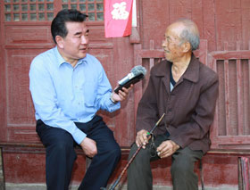 中央臺“走轉(zhuǎn)改”傾聽貴州大型采訪活動啟動,圖為記者王求向當(dāng)?shù)卮迕耜愘F忠一家了解情況。(中廣網(wǎng)記者 涂傲/攝)