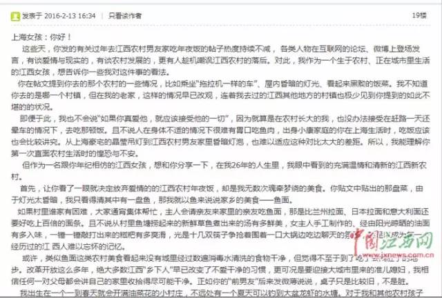 2月13日,一名自稱是在江西農(nóng)村長大的網(wǎng)友“爾雅2016”在中國江西網(wǎng)(江西手機(jī)報(bào))的“大江論壇”發(fā)帖,給這位上海女孩寫了一封信,講述了她眼中充滿溫情和清新的江西農(nóng)村。