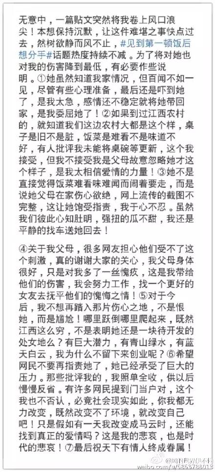 面對網(wǎng)上的眾說紛紜,2月10日,事件中的江西男友終于在微博上發(fā)表聲明,表示江西“有巨大潛力,有青山綠水,有藍(lán)天白云,我為什么不留下來創(chuàng)業(yè)呢”。這位江西小伙決定“改變自己”,留在家鄉(xiāng)創(chuàng)業(yè)的做法得到了許多網(wǎng)友的點(diǎn)贊。