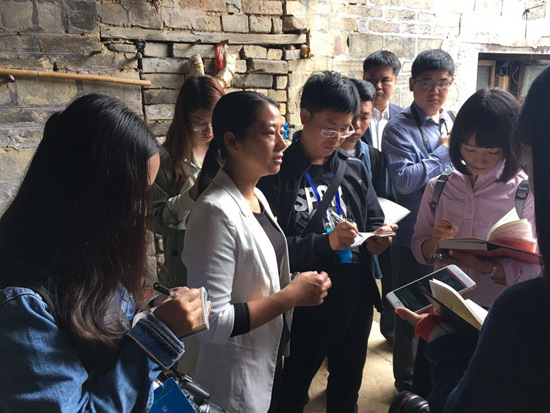 大灣村第一書(shū)記、扶貧工作隊(duì)隊(duì)長(zhǎng)余靜(中)接受記者采訪 人民網(wǎng)記者羅旭 攝