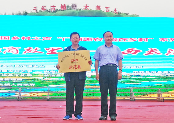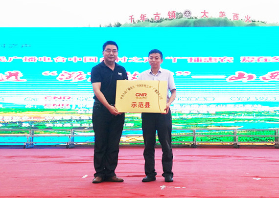 中央人民廣播電臺山西記者站康維佳站長授“中央人民廣播電臺中國鄉(xiāng)村之聲廣播惠農(nóng)工程示范縣”牌匾,中共長治縣委宣傳部張延節(jié)部長接牌。