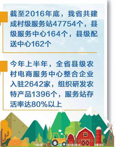 政策給力,讓我省農(nóng)村電商網(wǎng)絡(luò)快速織密。截至2016年底,我省共建成村級(jí)服務(wù)站47754個(gè),縣級(jí)服務(wù)中心164個(gè),縣級(jí)配送中心162個(gè),實(shí)現(xiàn)了縣域農(nóng)村電子商務(wù)公共服務(wù)體系全覆蓋、農(nóng)村電子商務(wù)雙向流通渠道全覆蓋、農(nóng)村電子商務(wù)應(yīng)用普及全覆蓋。