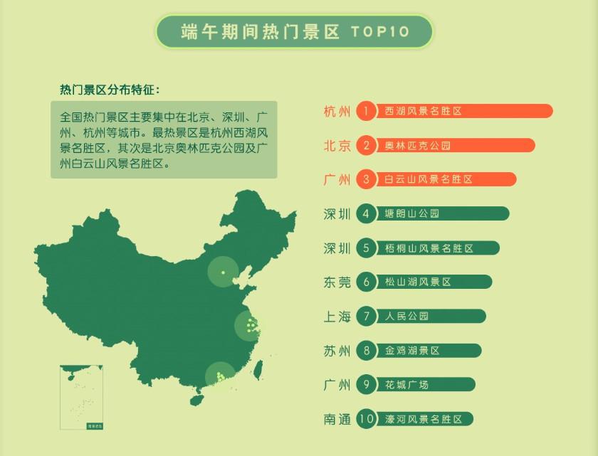 《指南》顯示,端午期間全國熱門景區(qū)主要集中在北京、深圳、廣州、杭州等城市。最熱景區(qū)是依舊是杭州西湖風(fēng)景名勝區(qū),其次是北京奧林匹克公園和廣州白云山風(fēng)景名勝區(qū)。