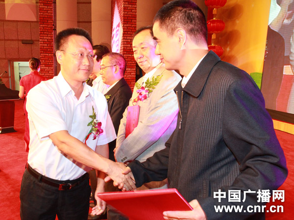 中央人民廣播電臺中國鄉(xiāng)村之聲開播儀式今日在北京舉行,圖為中央人民廣播電臺副臺長趙子忠(左)為中國鄉(xiāng)村之聲專家顧問團代表頒發(fā)聘書。