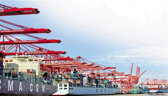 在塔吊林立、集裝箱成山的寧波舟山港,裝載上4000個(gè)集裝箱的出口貨物后,體型龐大的“地中海杰德”號(hào)鳴笛起航,這些貨物將被運(yùn)往“一帶一路”沿線國(guó)家的市場(chǎng)。