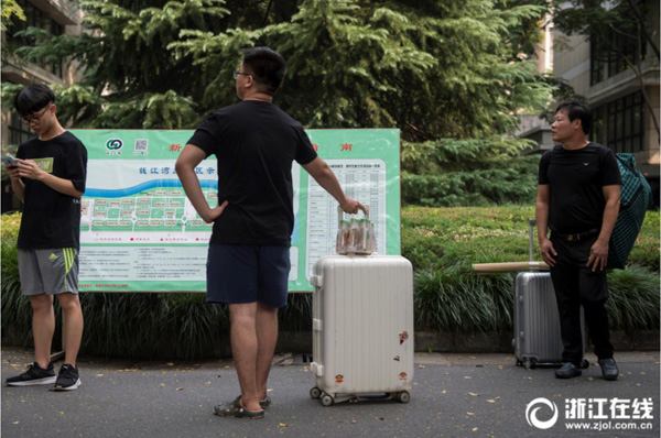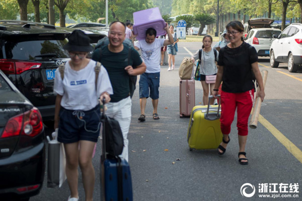 9月6日,又到一年開學季,下沙各高校校園內(nèi)堪比春運現(xiàn)場。校園里家長人數(shù)甚至超過了學生,最重的行李也往往都在父母的肩膀上。父母們不遠千里來送孩子上學,幫孩子背行李、代辦手續(xù)、打掃寢室衛(wèi)生,忙得不可開交。有的高校也在校園里豎起了讓孩子獨立的宣傳語。(浙江在線記者 馮賀 張孫超 見習記者 奕婷婷 攝)