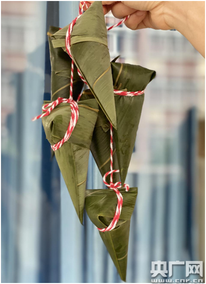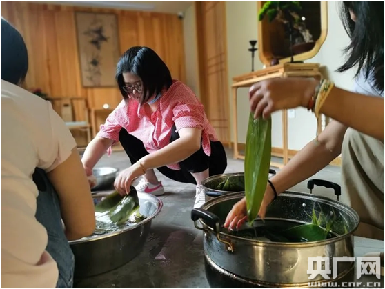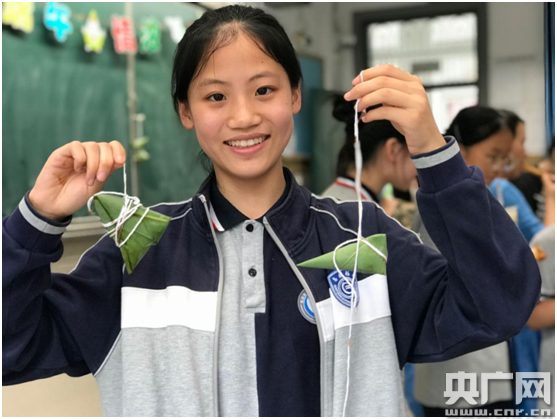 折葉、盛料、壓實(shí)、裹葉、扎繩……一雙雙忙碌的手穿梭在一張張翠綠的粽葉間,一道道工序有條不紊地進(jìn)行著,一片片清香的粽葉、一粒粒晶瑩的糯米,在同學(xué)們靈巧的手中翻轉(zhuǎn)飛舞,轉(zhuǎn)眼就變成了一個(gè)個(gè)誘人的粽子。