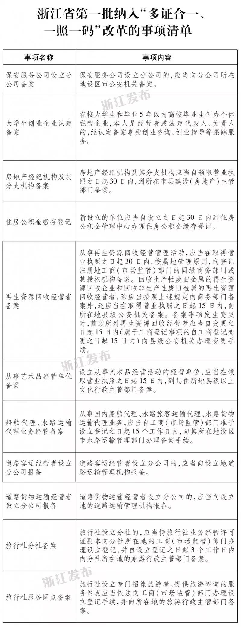 清單實行動態(tài)化管理,先行推進第一批11項 “多證合一、一照一碼”改革。對暫未納入清單的事項,要積極創(chuàng)造條件,成熟一批、公布一批、實施一批。涉及省級以上權限的,要主動爭取,使盡可能多的涉企證照在浙江省先行實現(xiàn)“多證合一、一照一碼”。