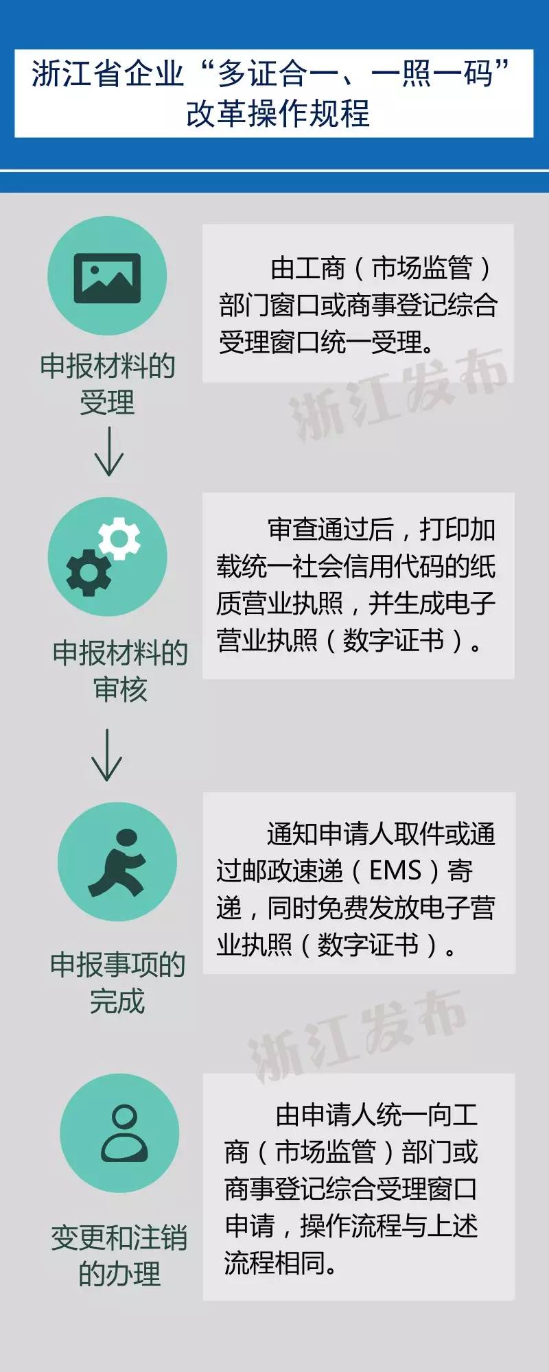 浙江省政府辦公廳日前下發(fā)《關于加快推進“多證合一、一照一碼”改革的通知》,要求在已實施的企業(yè)和農民專業(yè)合作社“五證合一、一照一碼”、個體工商戶“兩證整合”的基礎上,將涉及企業(yè)(包括個體工商戶、農民專業(yè)合作社)登記、備案等有關事項和各類證照(以下統(tǒng)稱涉企證照)進一步整合到營業(yè)執(zhí)照上,從2017年7月1日起在全省范圍內實行“多證合一、一照一碼”改革。